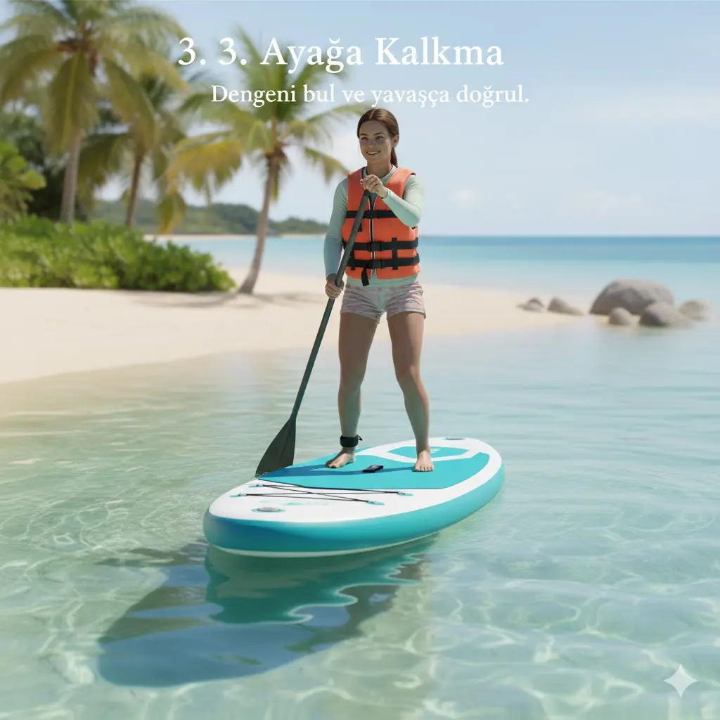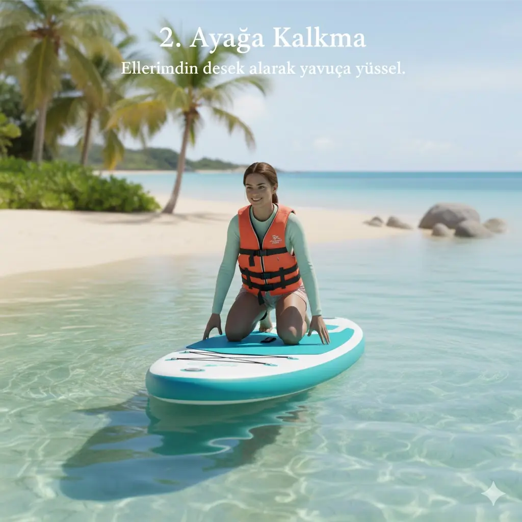 Ayağa Kalkma: Dengeni bulduğun an, ellerini board’un yanlarına koy ve tek tek ayaklarını dizlerinin olduğu yere yerleştir. Yavaşça doğrulurken dizlerini hafif kırık tut; bu senin "süspansiyonun" olacak.