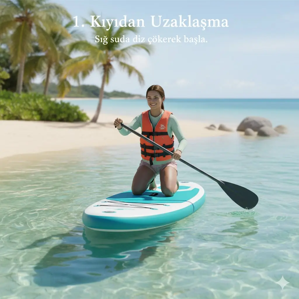 Kıyıdan Uzaklaşma: Önce sığ bir yerde, dizlerinin üzerinde board’un tam ortasına (genelde taşıma kolunun olduğu yer) yerleş. Birkaç kürek çekerek kıyıdan ve kayalıklardan uzaklaş.
