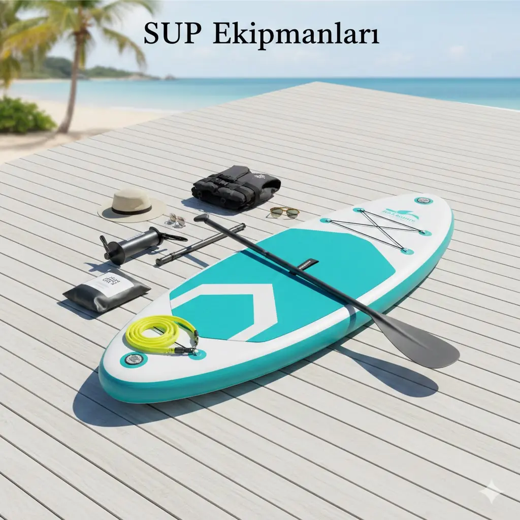 Board (Tahta): Yeni başlıyorsan geniş ve kalın (all-around) modeller dengede kalmanı kolaylaştırır. Kürek (Paddle): Küreğin boyu, kolunu havaya kaldırdığında el bileğine gelecek kadar uzun olmalıdır. Leash (Güvenlik Kordonu): En önemli parça! Tahtayı ayağına bağlar, böylece düşersen tahtan senden uzaklaşmaz. Can Yeleği: Yüzme bilsen bile güvenlik her zaman önce gelir.